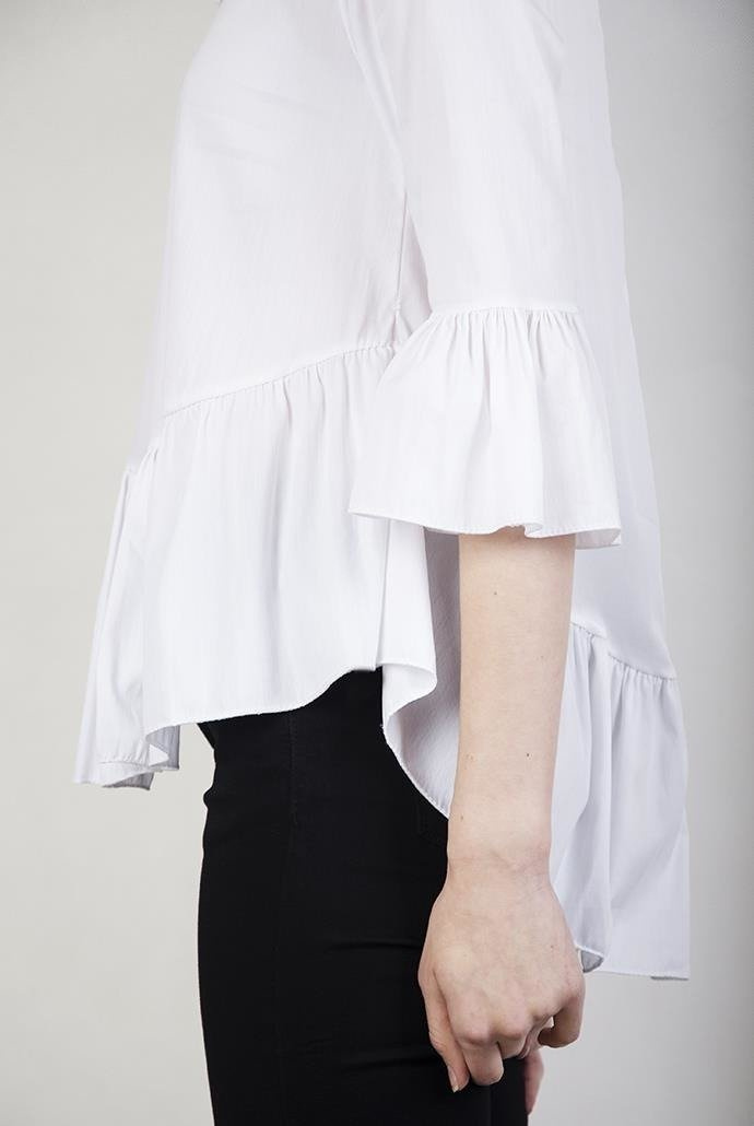 Biała bluzka z falbanami przy rękawach oraz na dole.