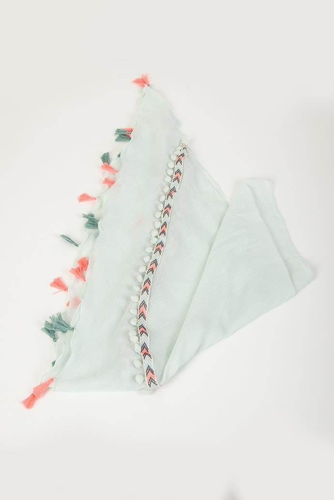 Miętowa chusta w formie trójkąta, z frędzelkami i kuleczkami .