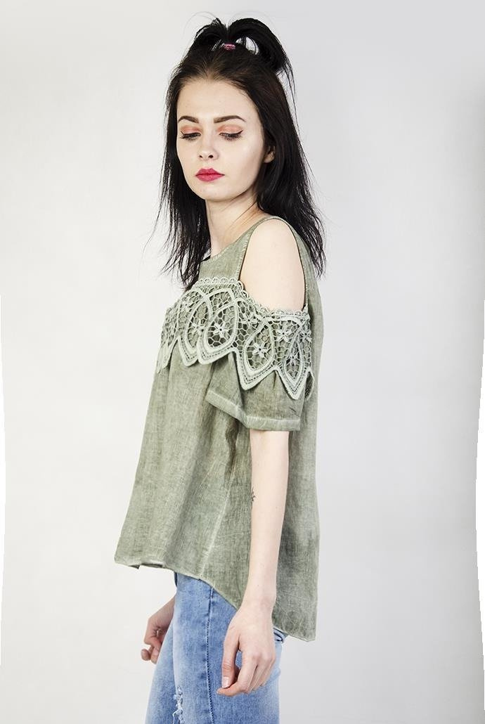 Zielona bluzka z wyciętymi ramionami i ażurowym zdobieniem.
