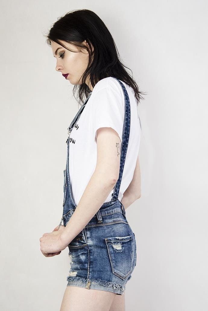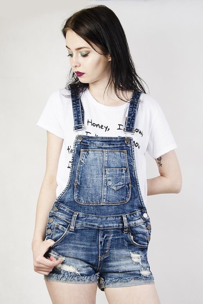 Jeansowe szorty ogrodniczki z szarpaniami na dole.