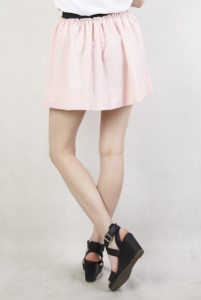 Jasnoróżowa rozkloszowana spódniczka z gumą w pasie.