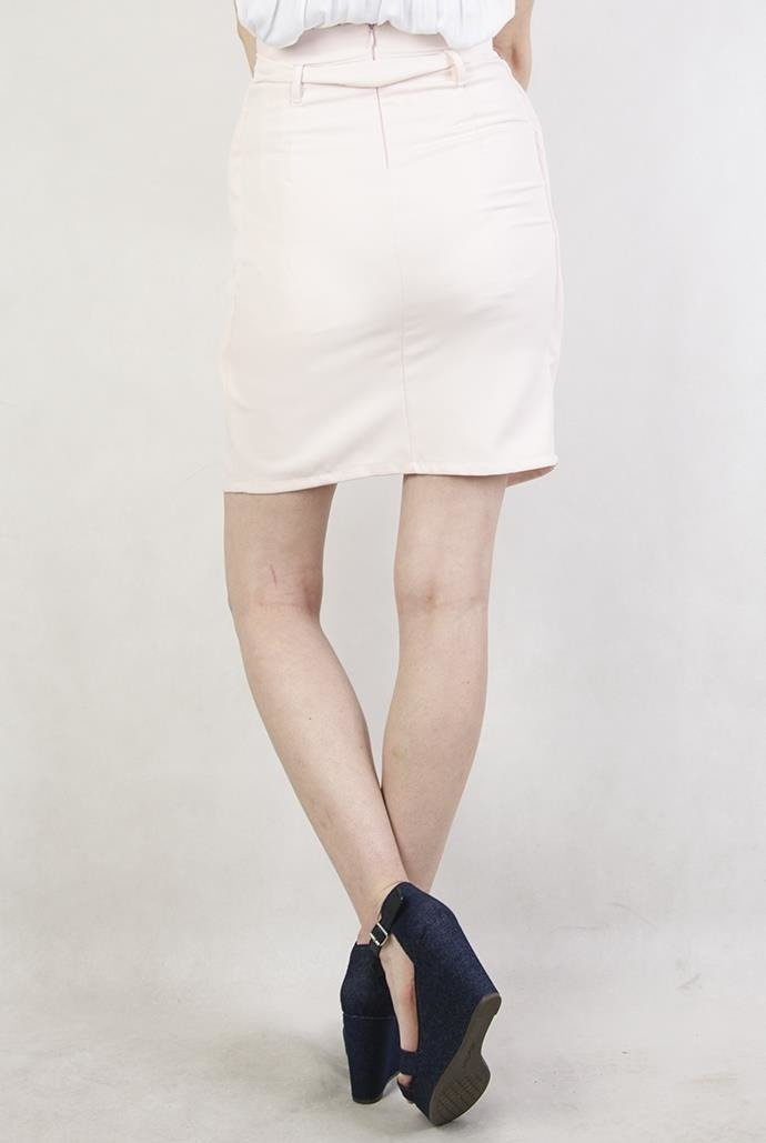 Jasnoróżowa spódniczka z wycięciem i kokardą z przodu.
