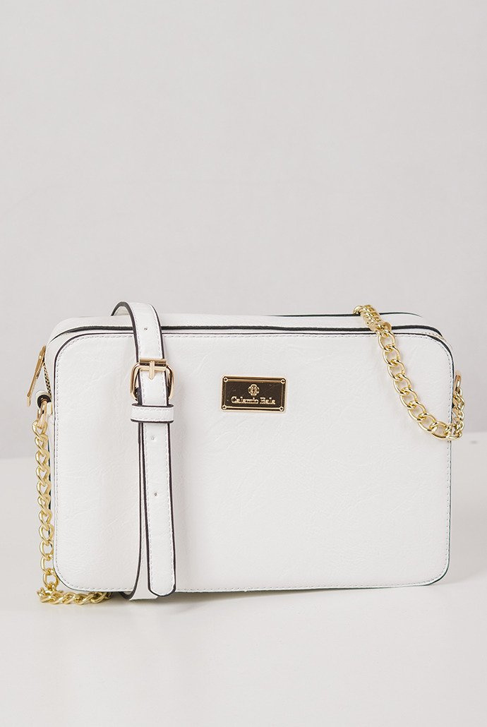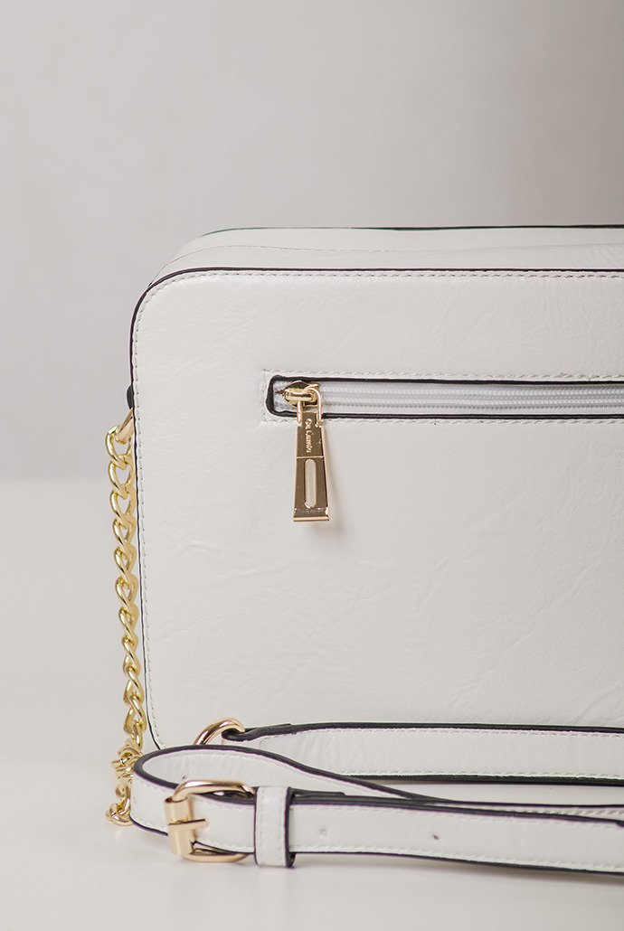 Kremowa, usztywniana torebka ze złotym łańcuszkiem, którego długość można regulować. W środku liczne przegródki na klucze czy portfel.