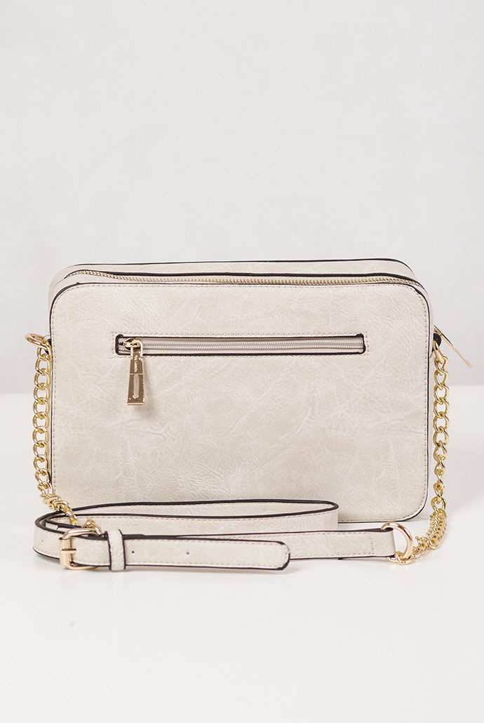 Beżowa, usztywniana torebka ze złotym łańcuszkiem, którego długość można regulować. W środku liczne przegródki na klucze czy portfel.
