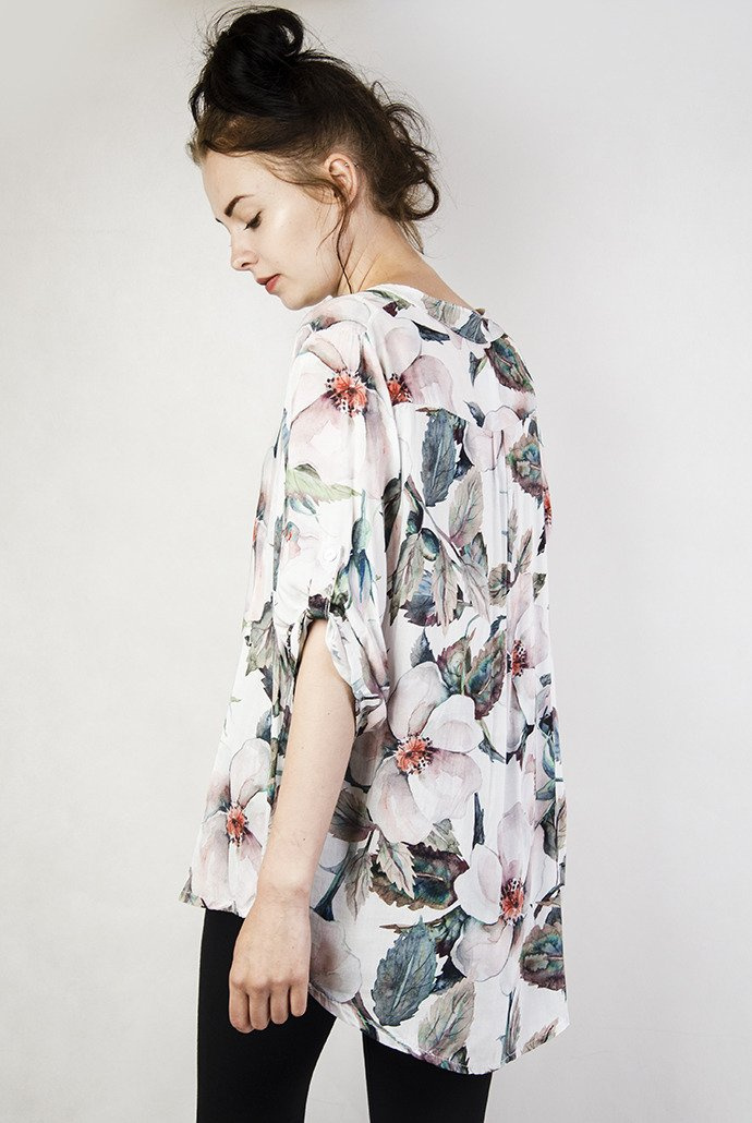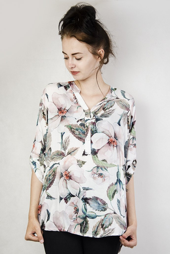 Koszula w kwiatowy wzór, z guzikami. Posiada możliwość zapięcia rękawa.