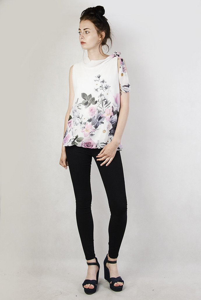 Biała, zwiewna bluzka z wiązaniem przy ramieniu, w kwiaty.