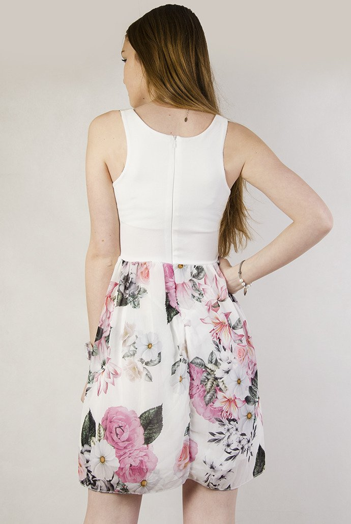Biała sukienka na ramiączka, z kwiatowym dołem.