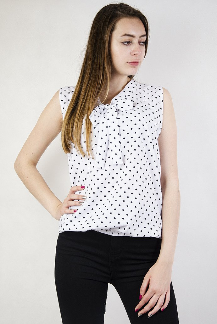 Biała, zwiewna bluzka w czarne serduszka.