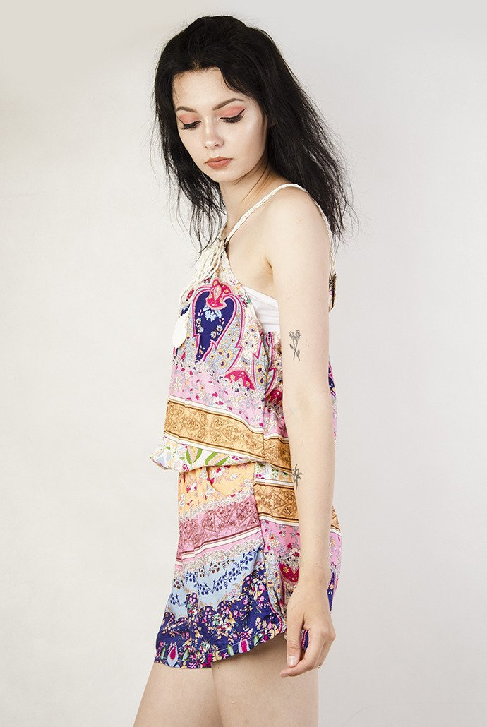 Wielokolorowy zwiewny kombinezon z wiązaniem wykończonym listkami.