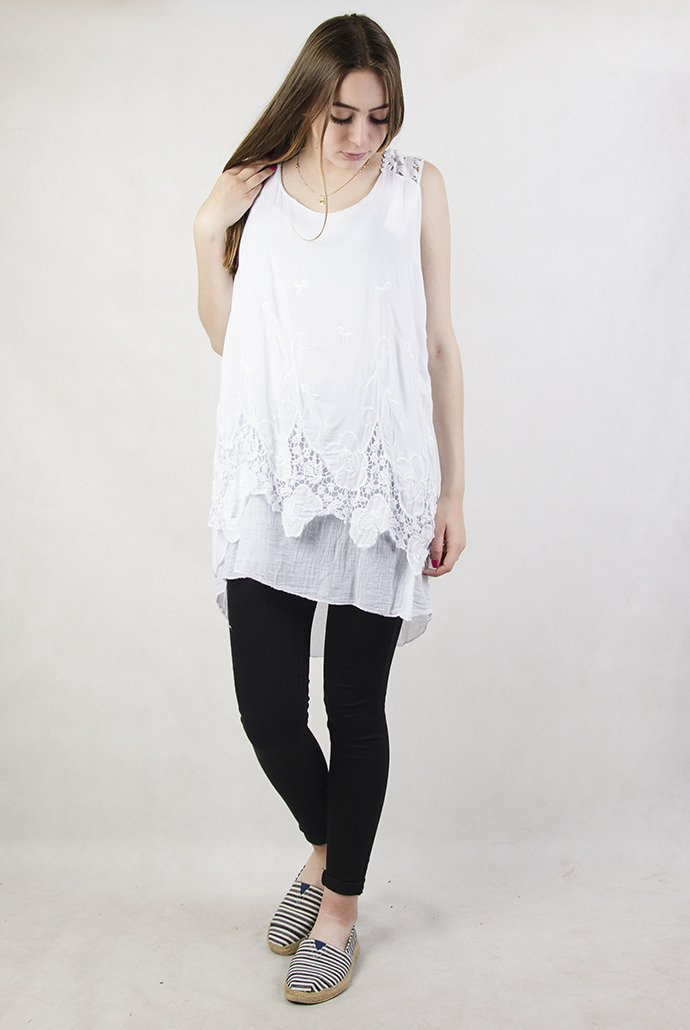 Biała bluzka dwuwarstwowa z dłuższym tyłem,z przodu posiada ażurowe zdobienia oraz na plecach.