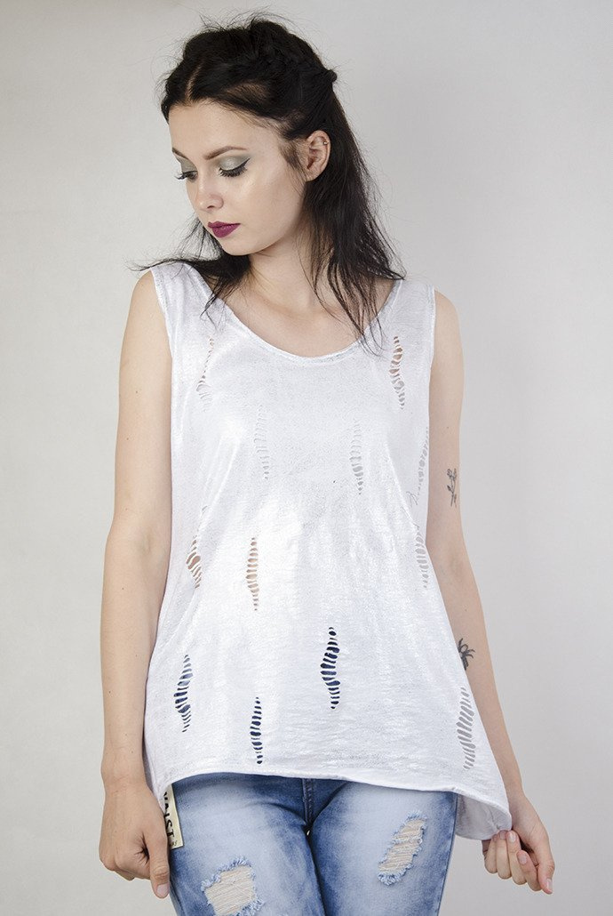 Biała bluzka pokryta brokatem, z wycięciami na przodzie