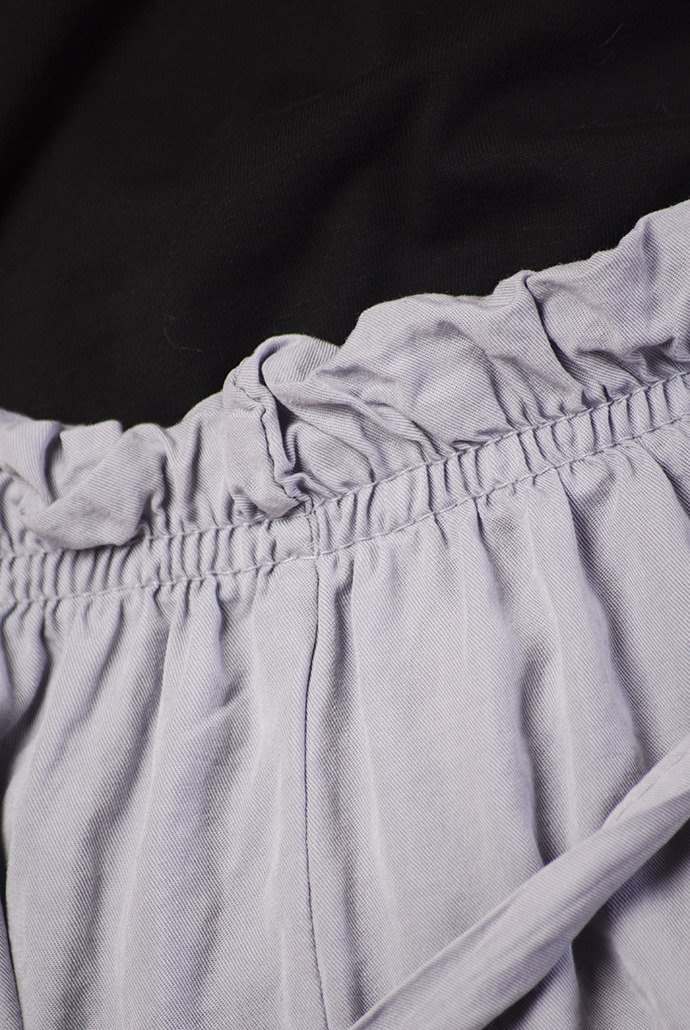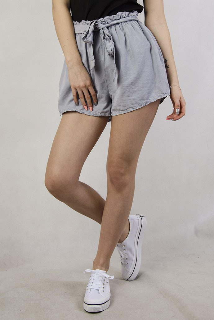 Szare zwiewne szorty z gumka w pasie oraz wiązaniem na wiele sposobów