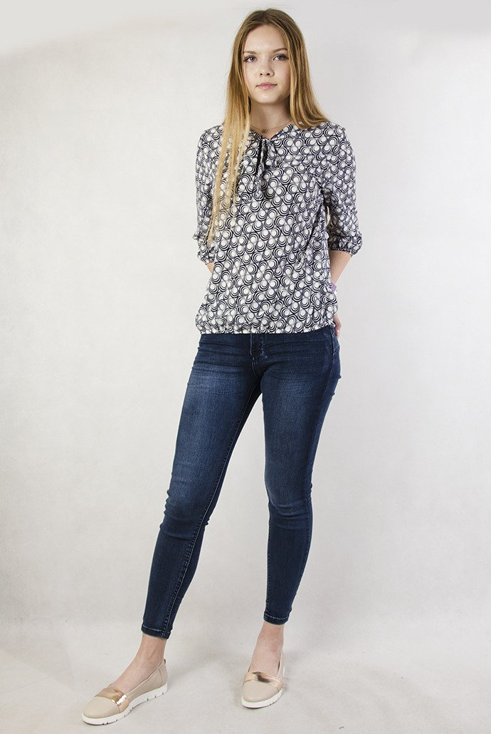 Posiada wiązanie przy dekolcie oraz gumkę na dole i przy rękawie.