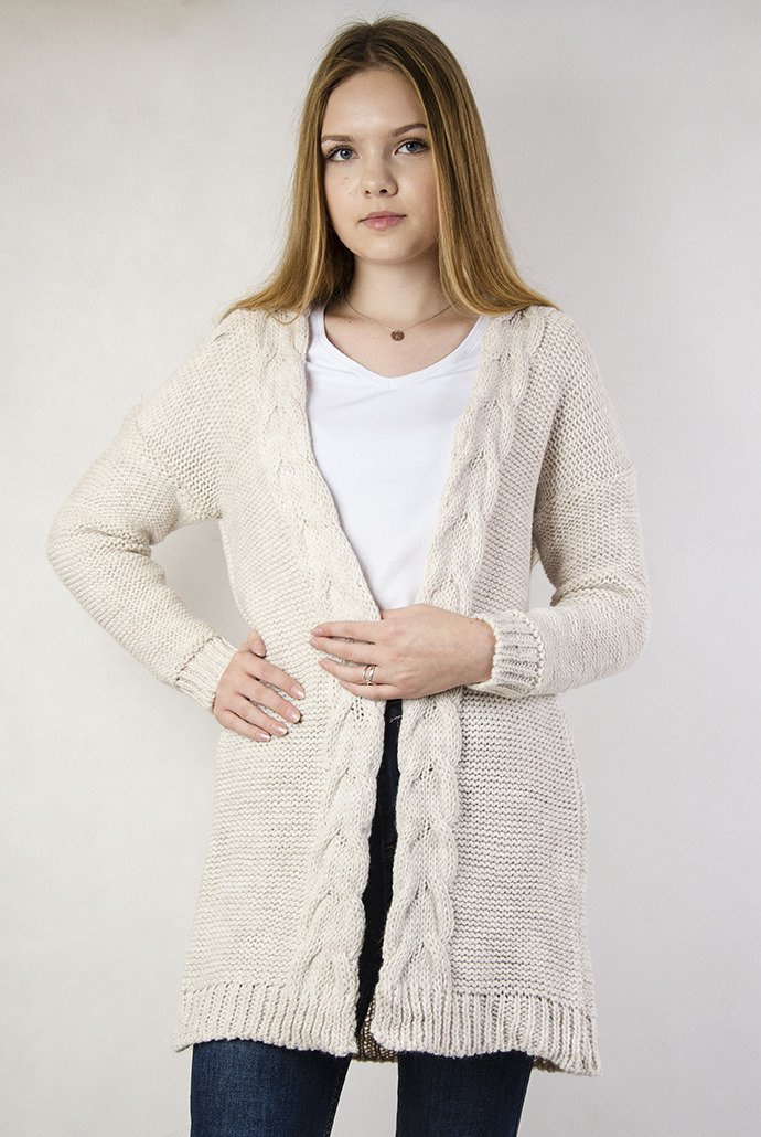 Beżowa narzuta sweterkowa, z plecionym warkoczem