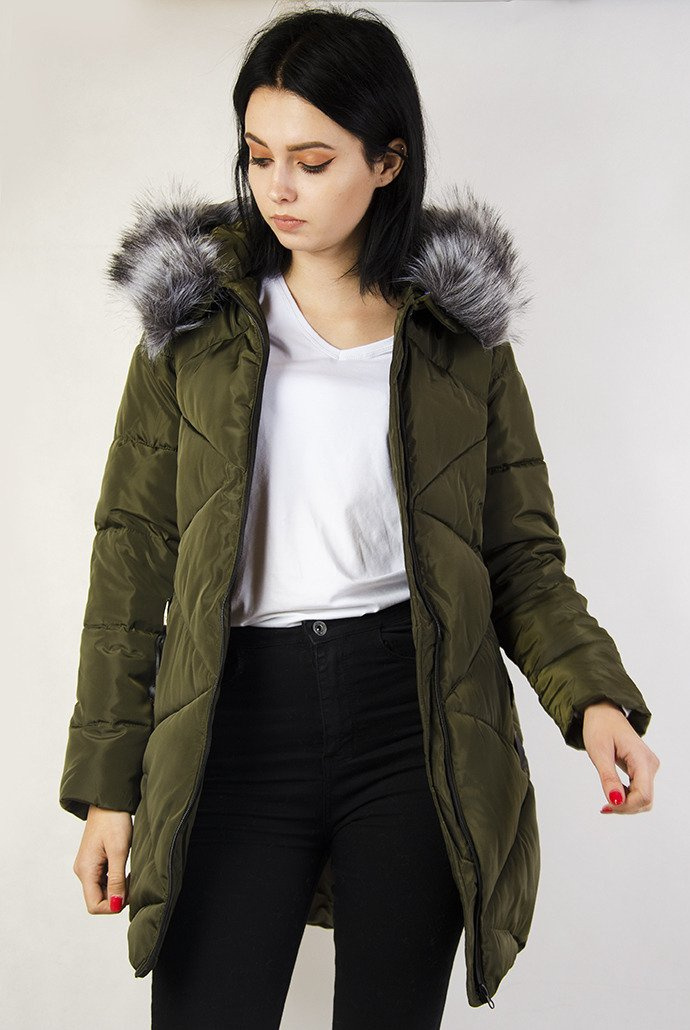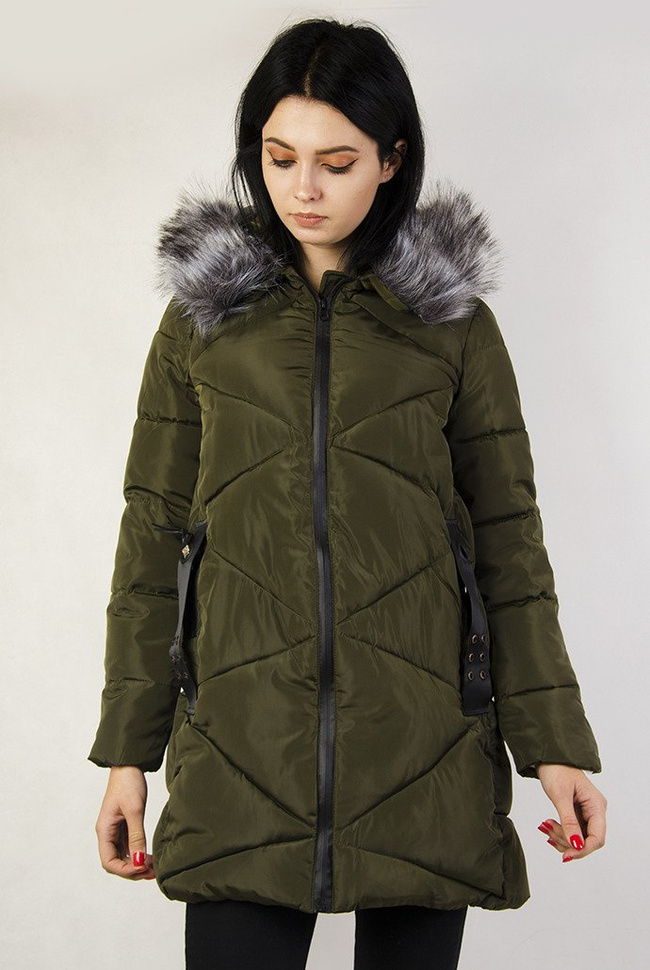 Zielona pikowana kurtka z ozdobnymi paskami przy kieszeniach.