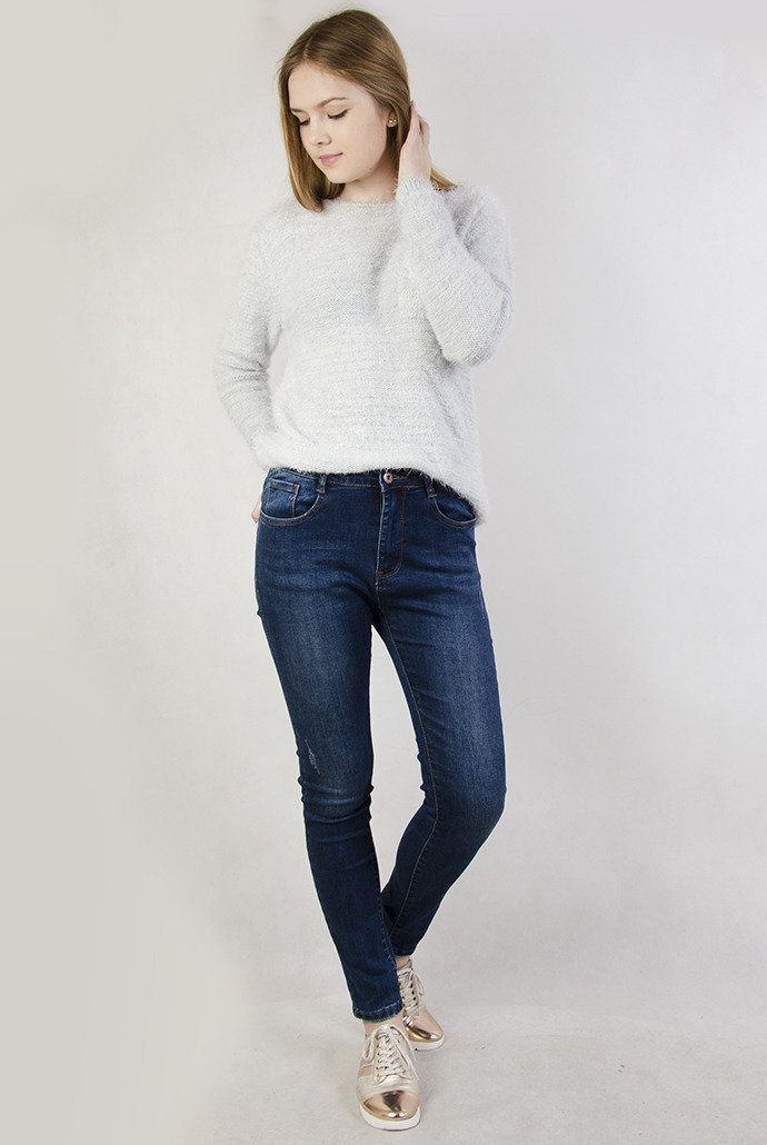 ( Rozmiary L-4 XL ) Spodnie jeansowe z wysokim stanem oraz delikatnymi przetarciami