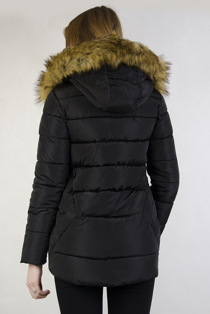 Czarna asymetryczna kurtka z pikowaniem oraz futerkiem przy kapturze