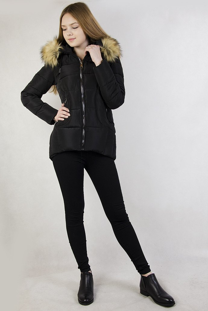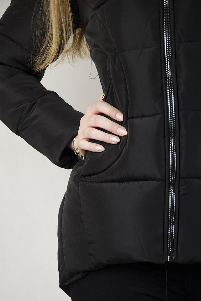 Czarna  asymetryczna kurtka z pikowaniem oraz futerkiem przy kapturze