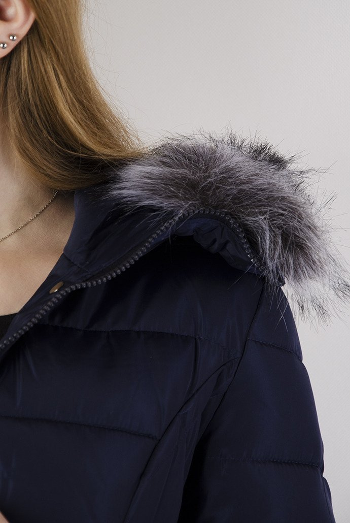 Krótka pikowana granatowa kurtka z futerkiem przy kapturze
