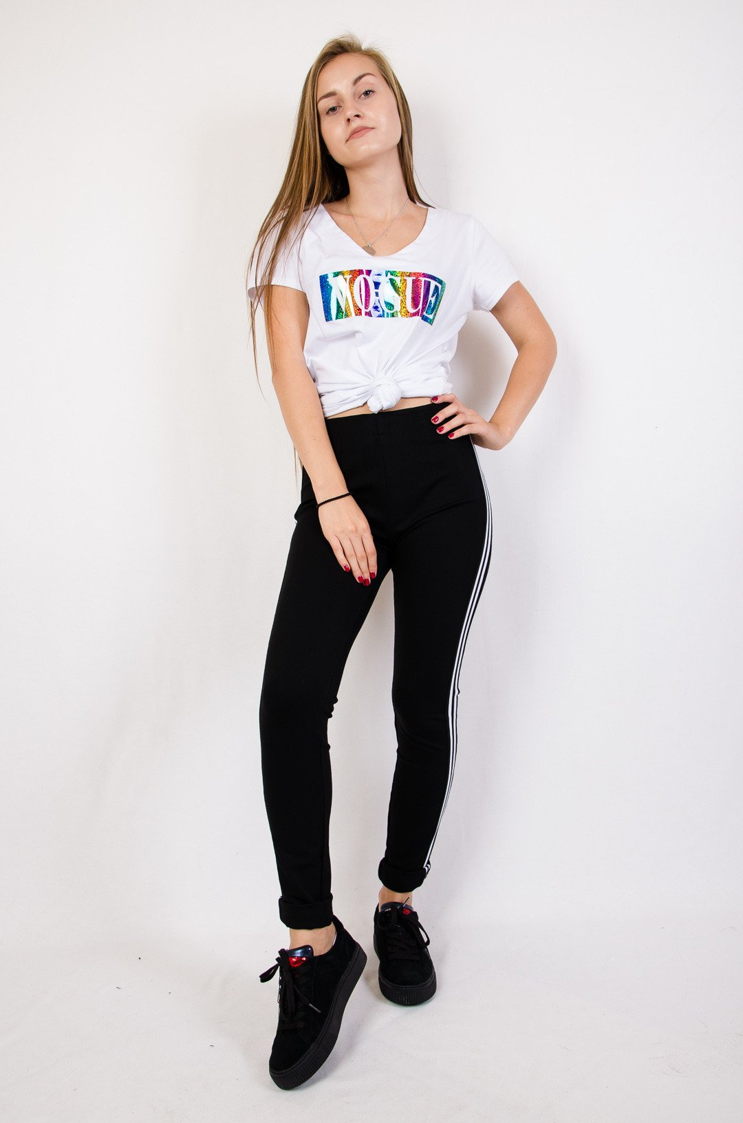 Czarne materiałowe spodnie z białymi paskami po bokach.