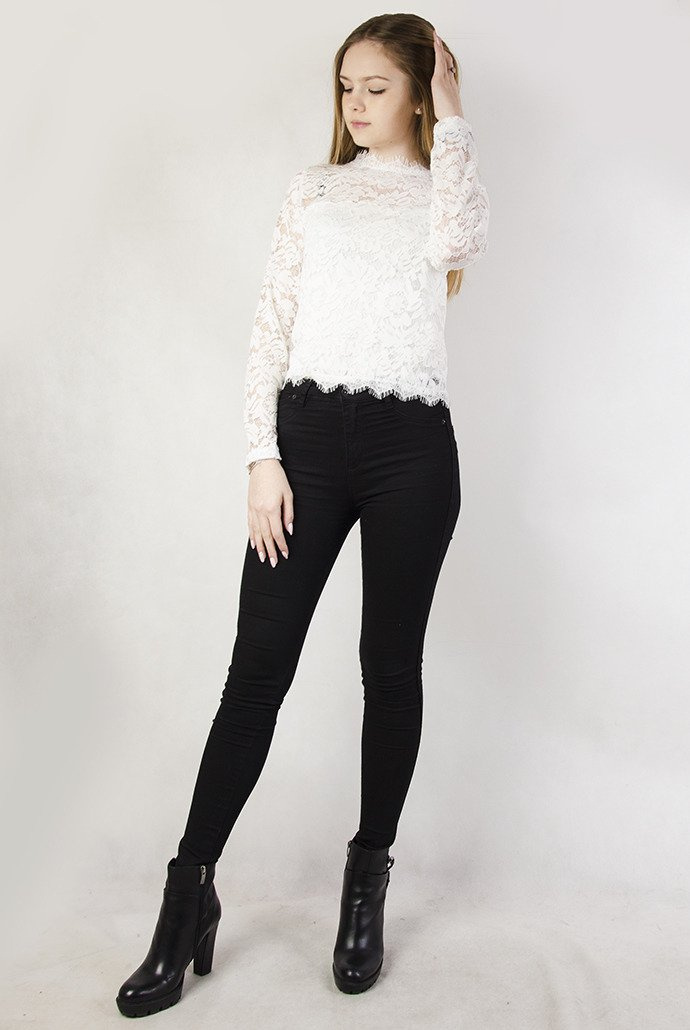 Biała koronkowa bluzka z długim rękawem oraz złotym zamkiem na plecach