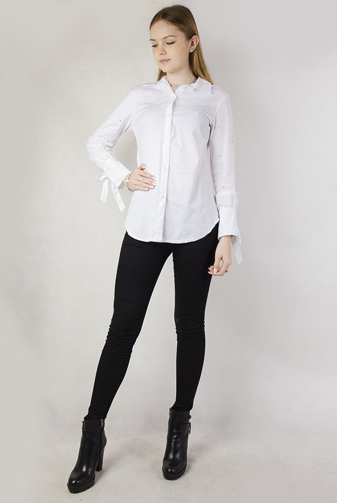 Biała koszula z perełkami oraz wiązaniem przy rękawach