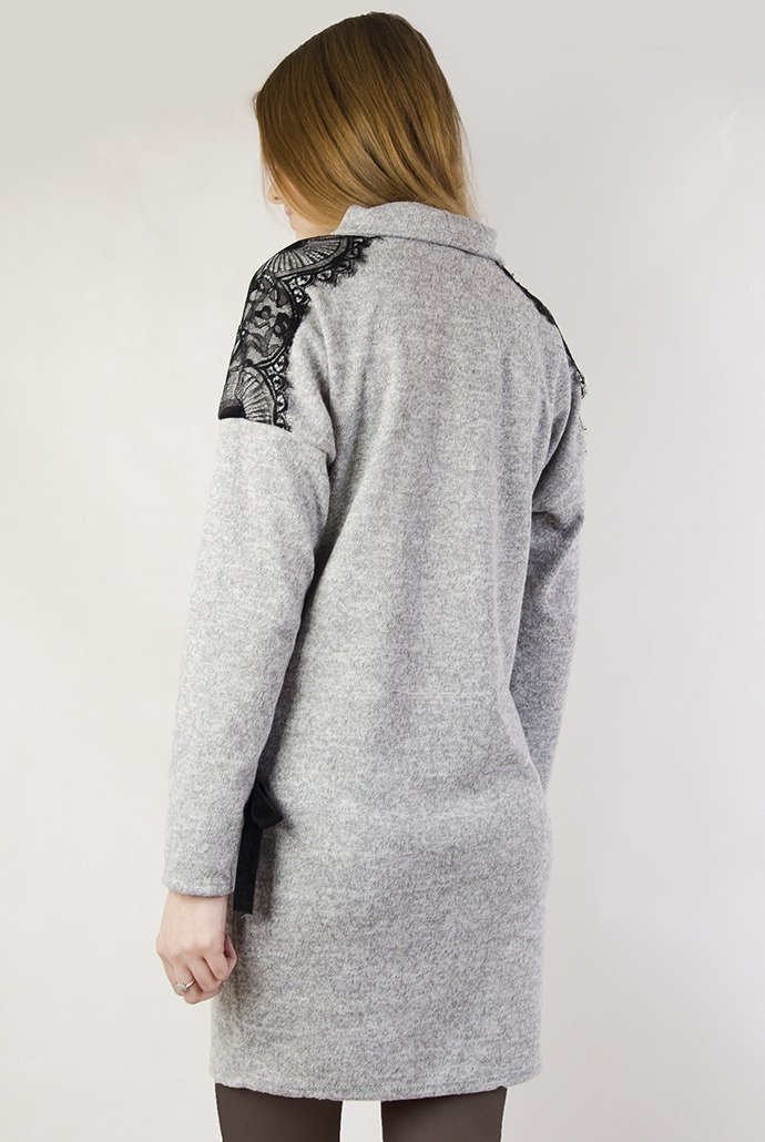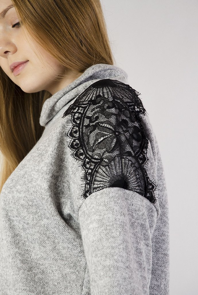Szara prosta sukienka z koronką na ramionach oraz golfem