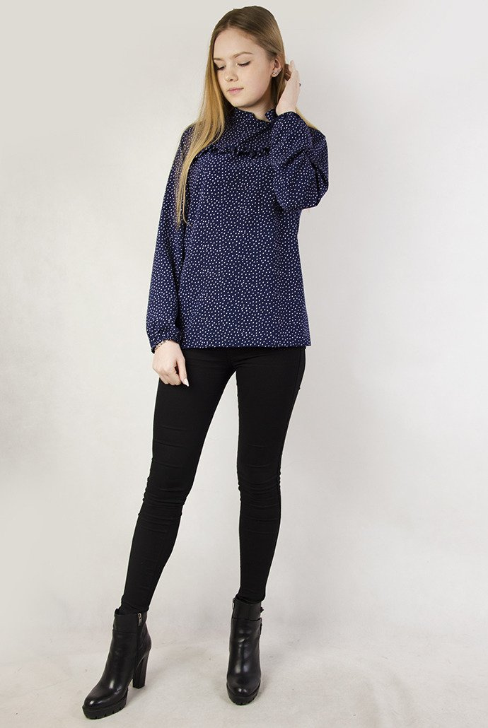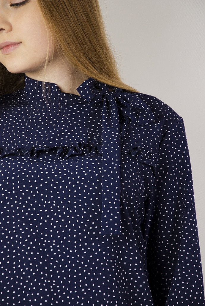 Granatowa bluzka koszulowa w białe kropki z wiązaniem przy dekolcie