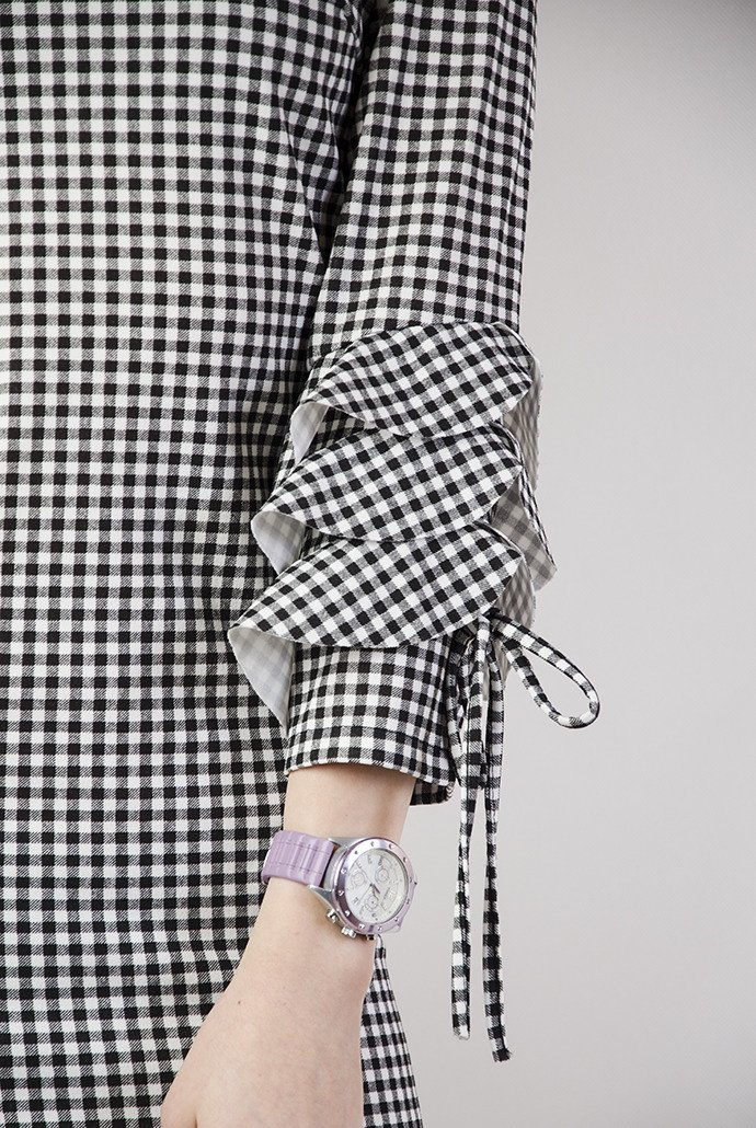 Sukienka w czarno-białą kratkę z falbanami przy rękawach