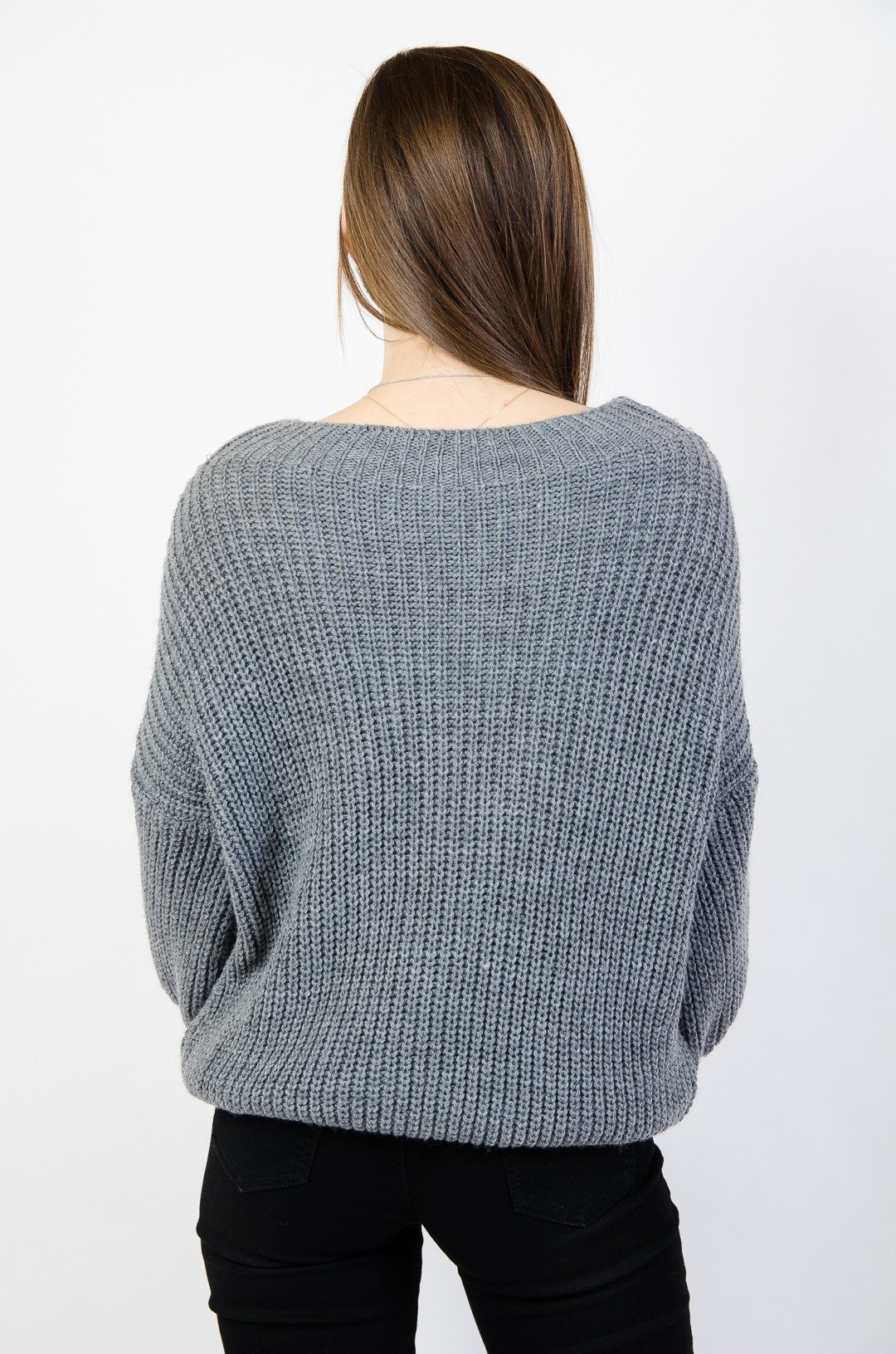 Szary sweter z szerokimi rękawami oraz doszytymi perełkami.