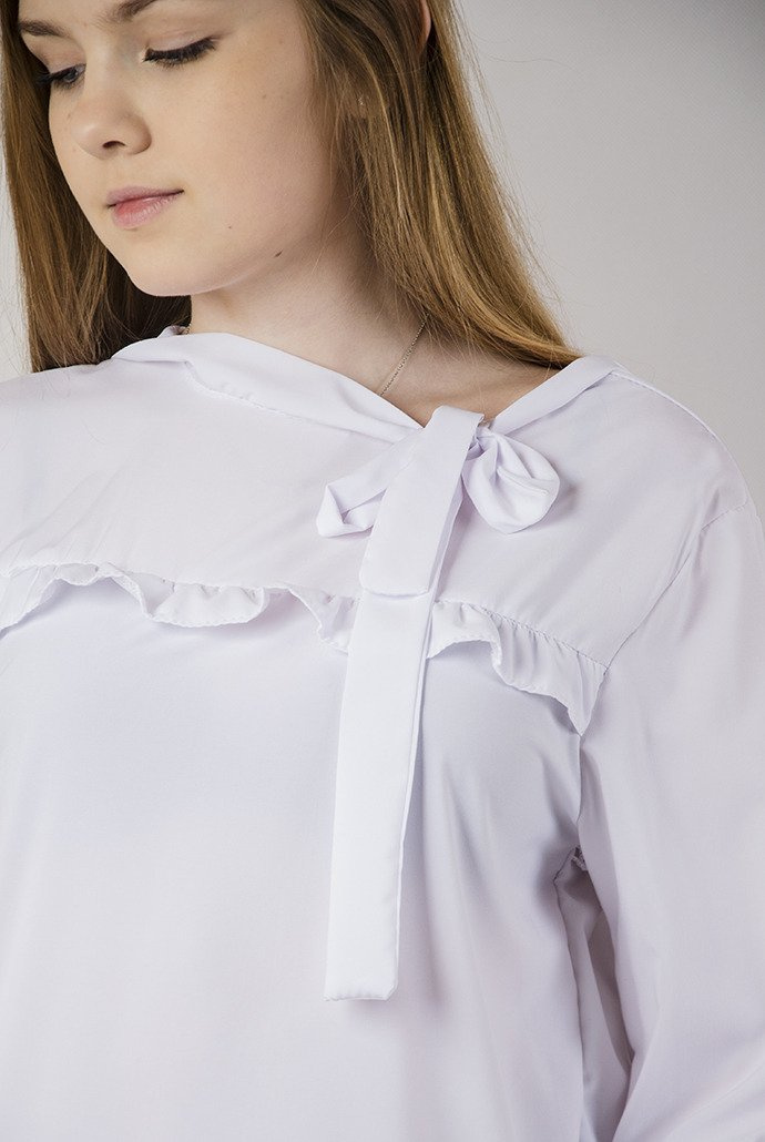 Biała bluzka koszulowa z falbanką oraz wiązaniem przy szyi