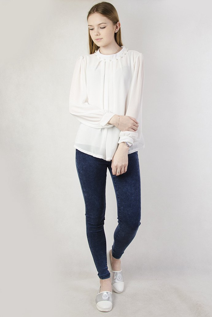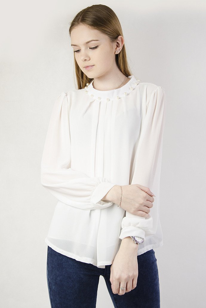 Biała bluzka z koralikami przy dekolcie