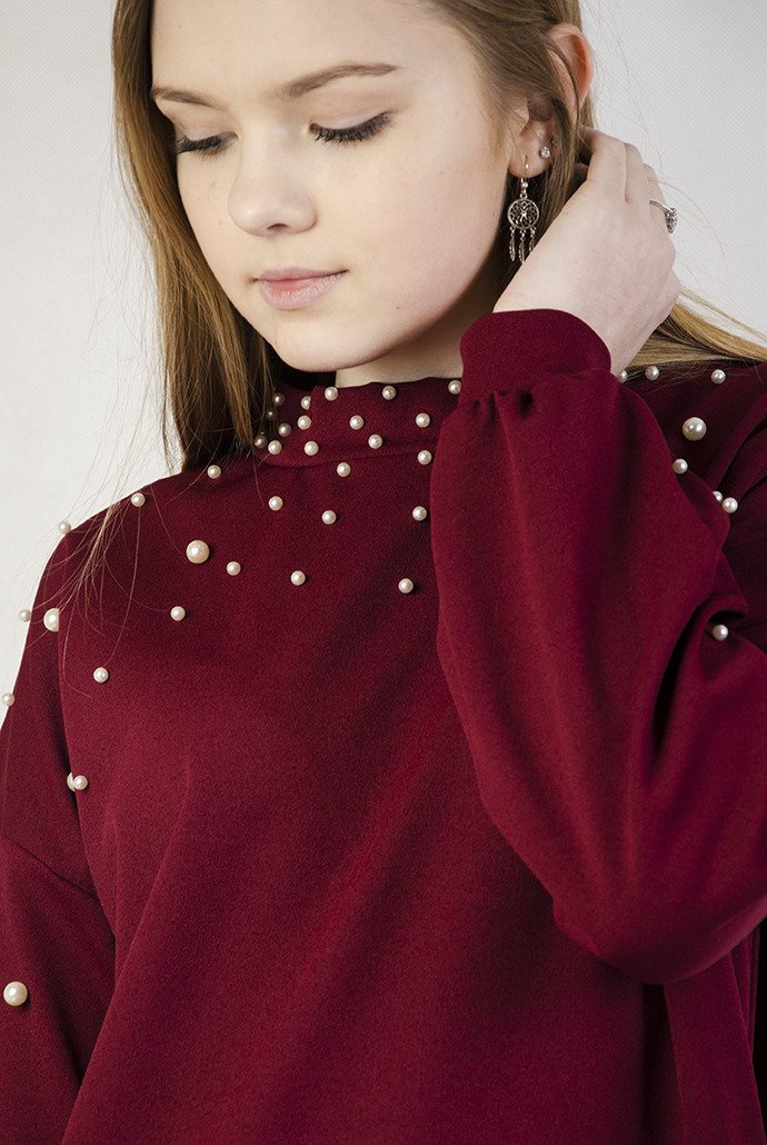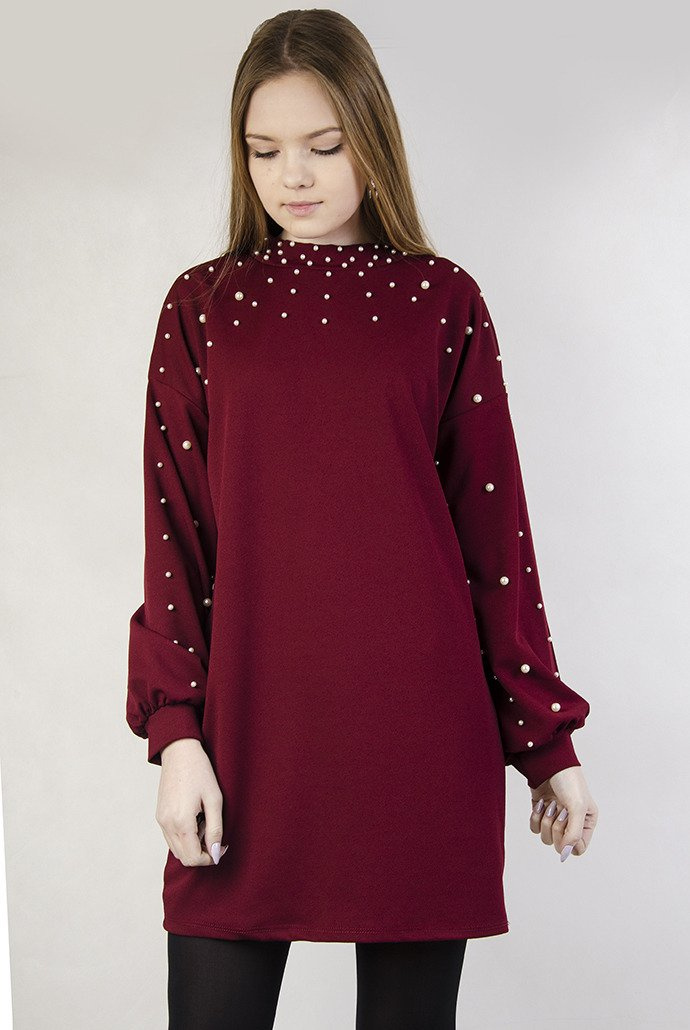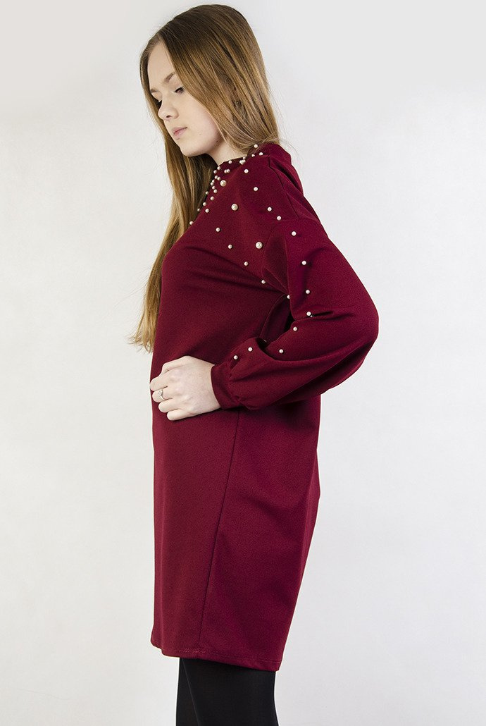 Bordowa sukienka z długim rękawem zakończonym ściągaczem.