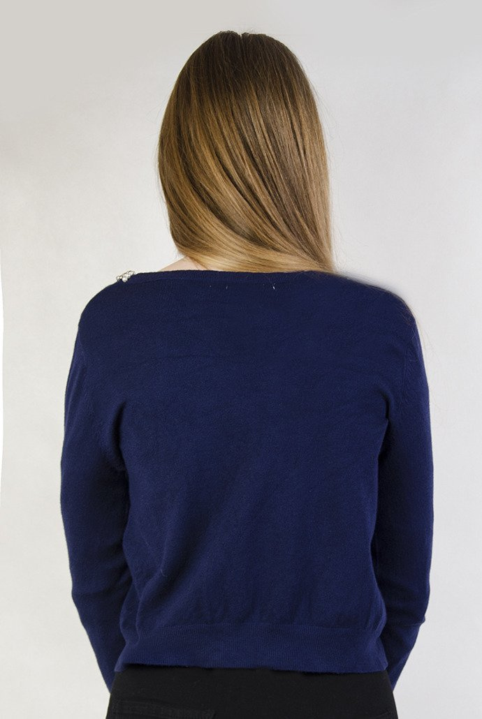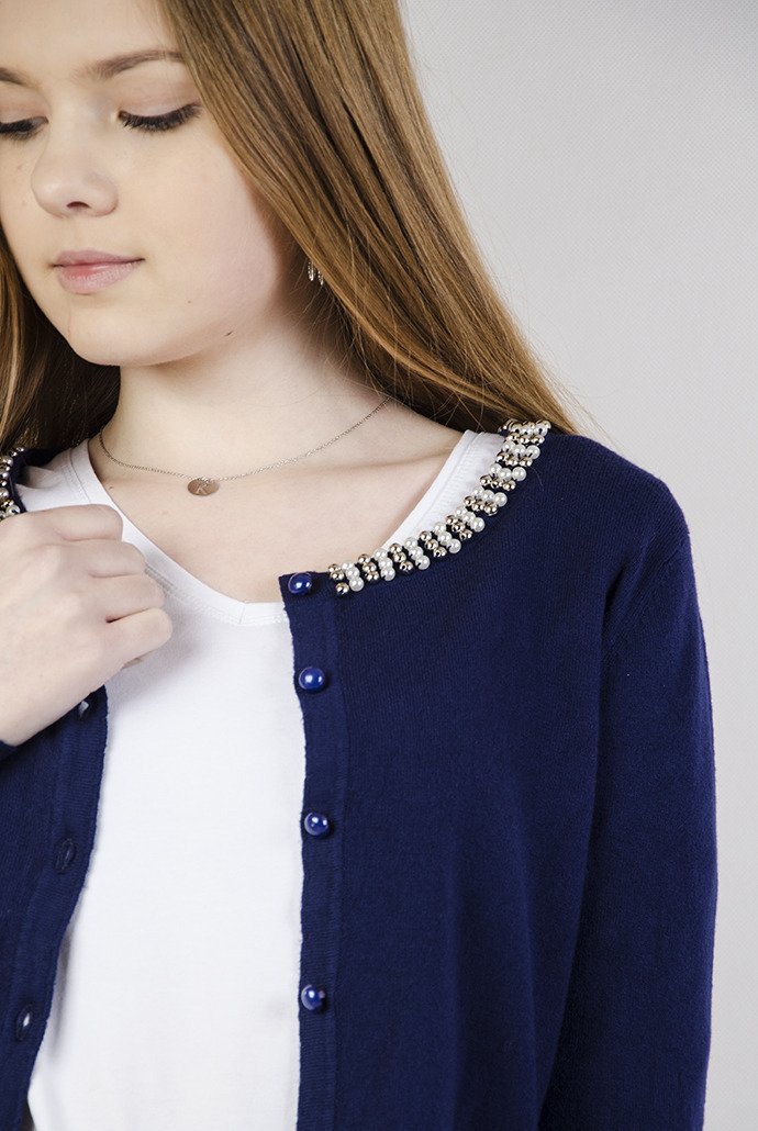 Granatowy krótki sweter zapinany na guziki z koralikami przy kołnierzu