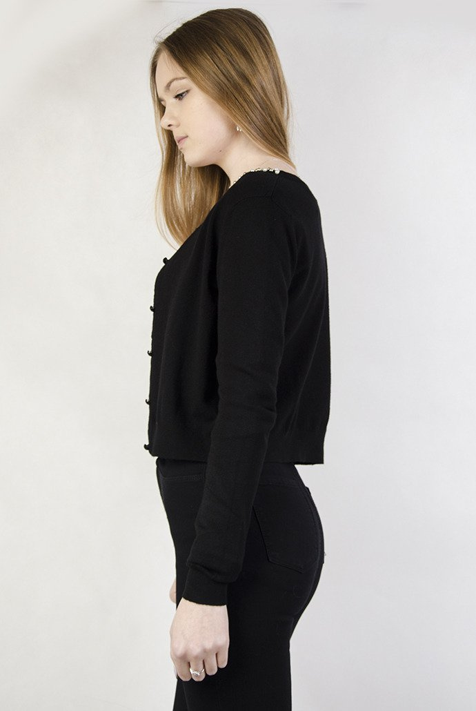 Czarny krótki sweter zapinany na guziki z koralikami przy kołnierzu