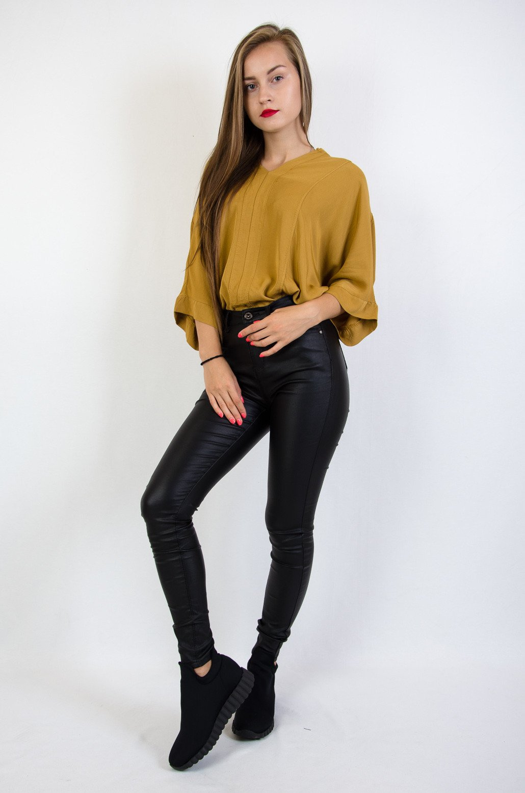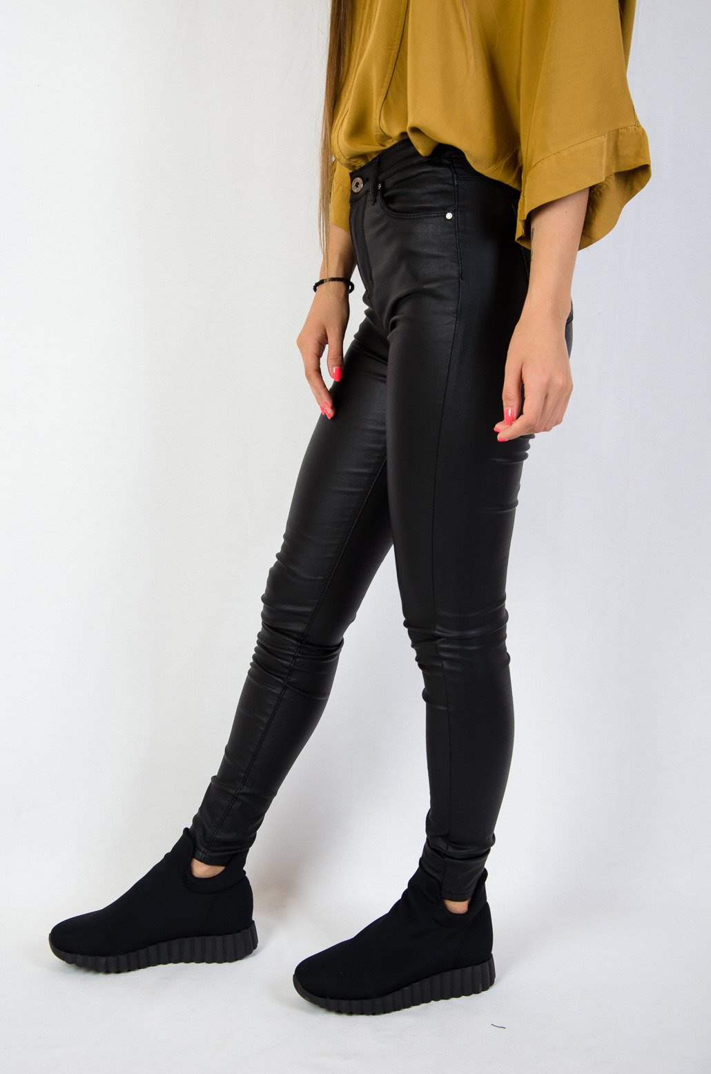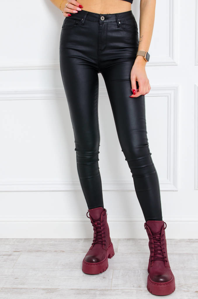 Czarne spodnie woskowane z wysokim stanem- imitacja skóry