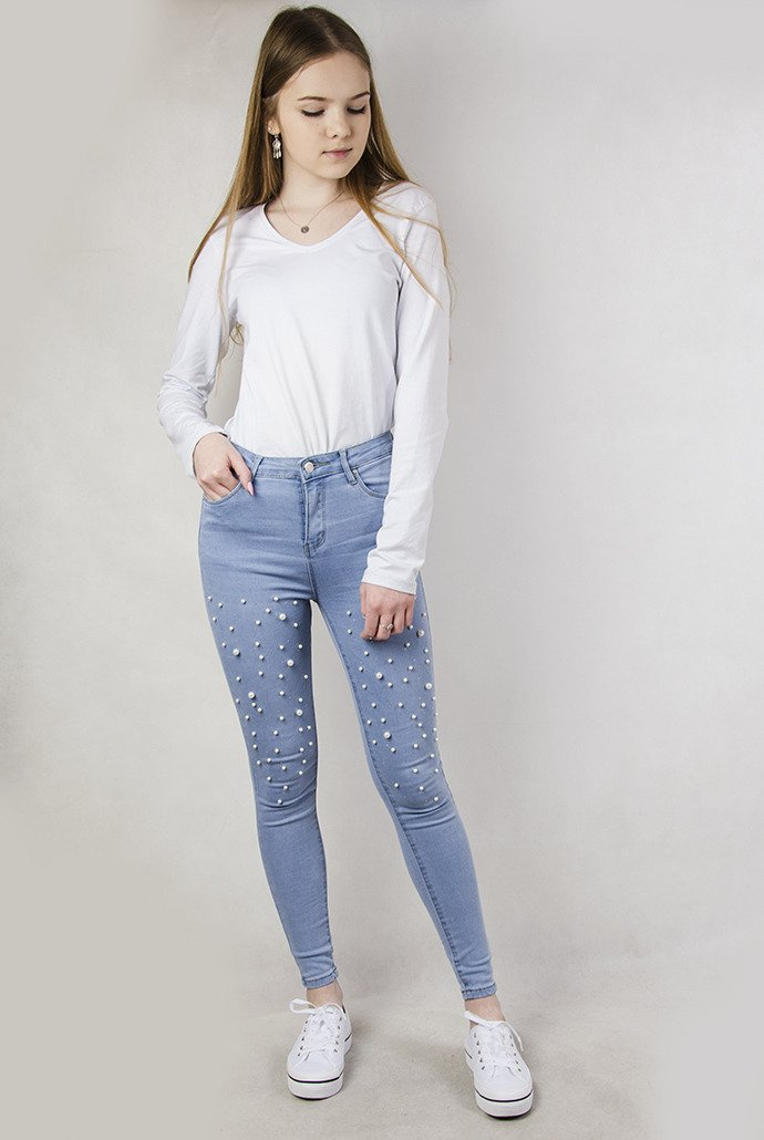 Jasne spodnie jeansowe z koralikami oraz cyrkoniami