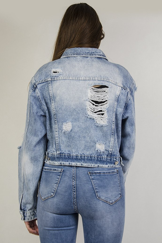 Kurtka jeansowa krótka z przetarciami oraz szarpaniami
