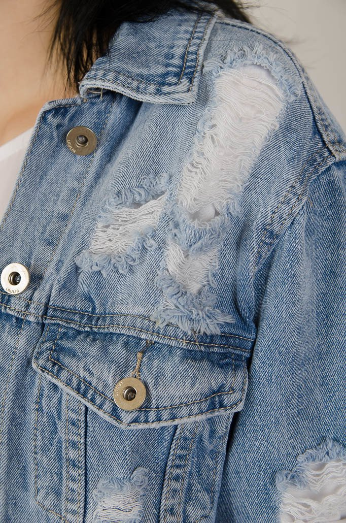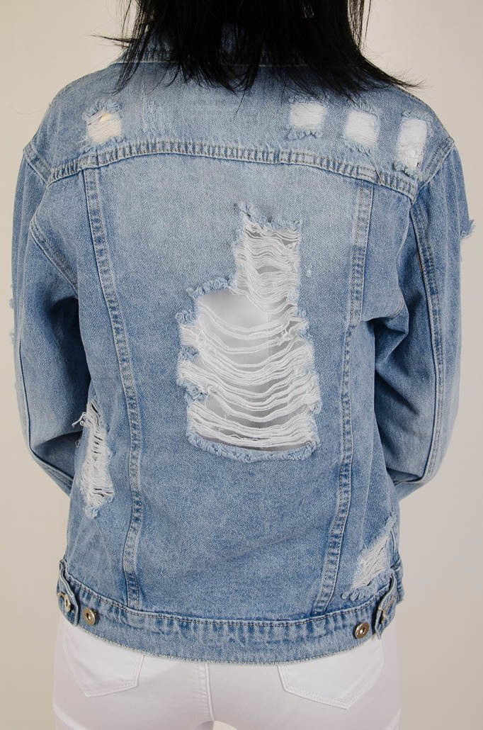 Kurtka jeansowa w jaśniejszym odcieniu jeansu, z licznymi przetarciami.