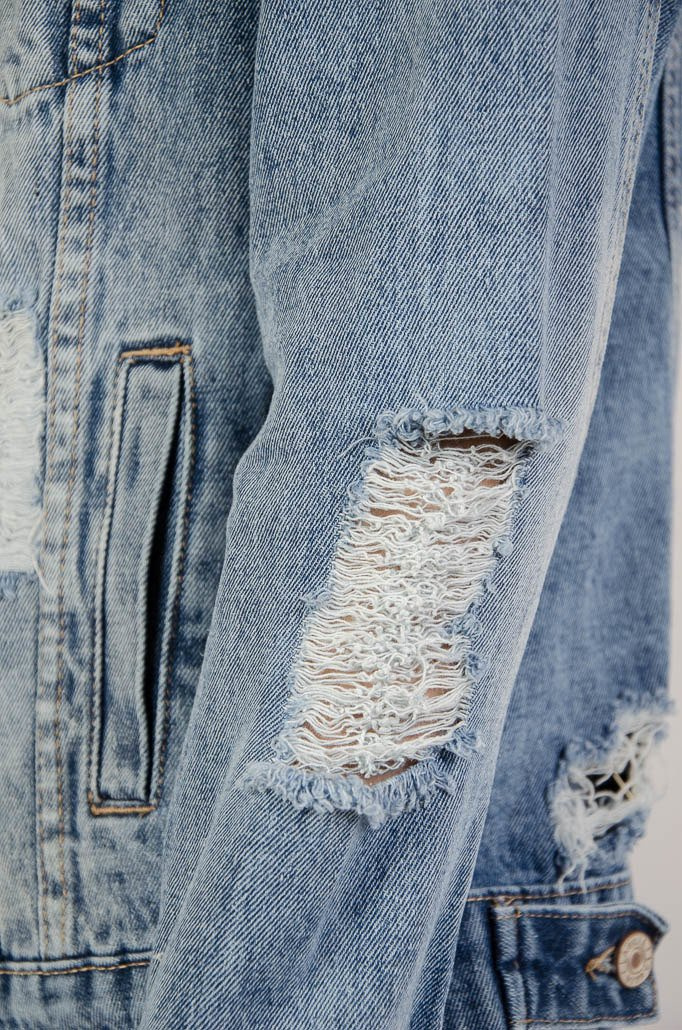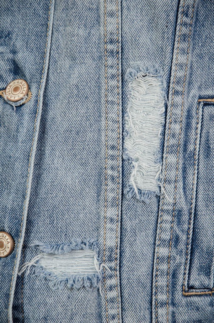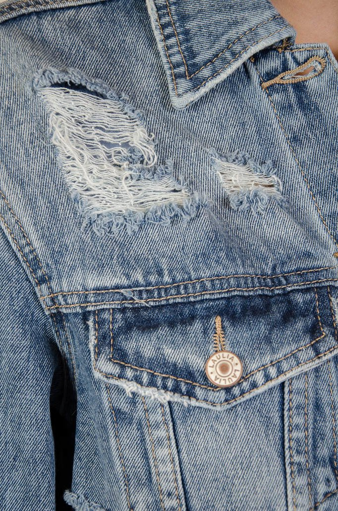 Kurtka jeansowa zapinana na guziki, z przetarciami.