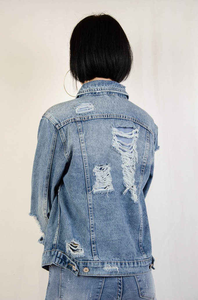 Kurtka jeansowa zapinana na guziki, z przetarciami