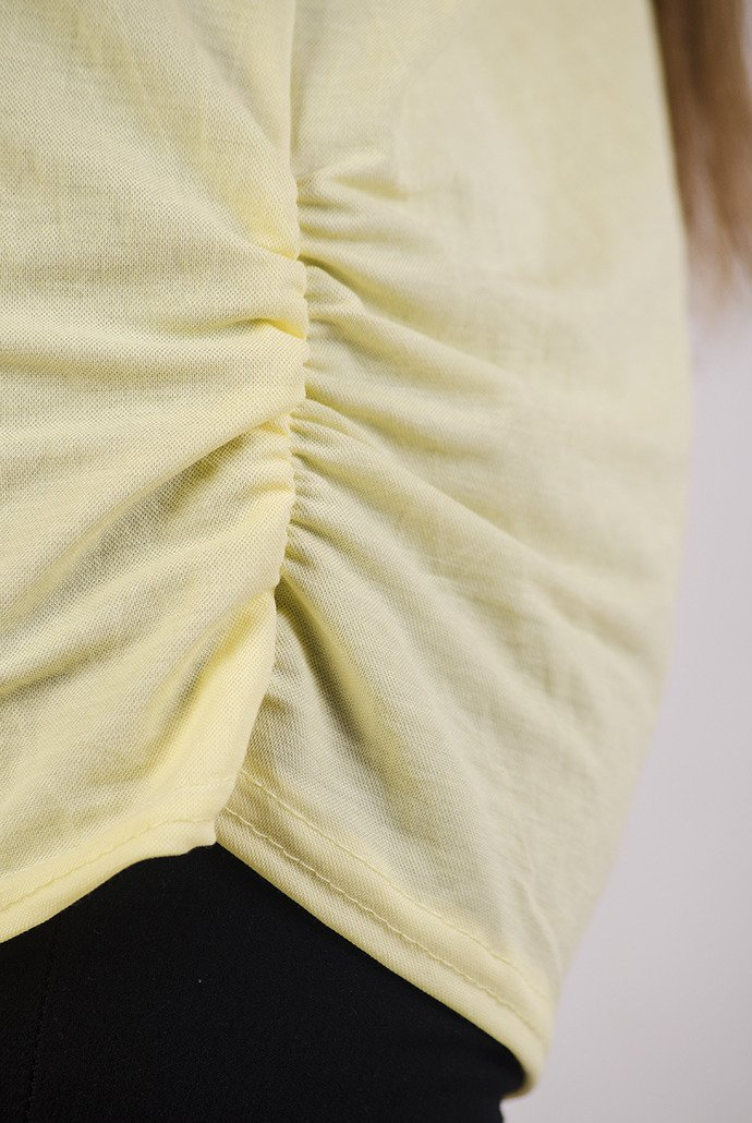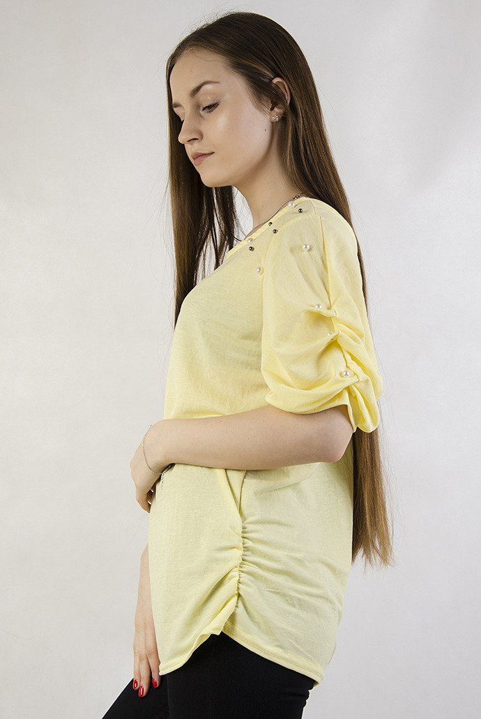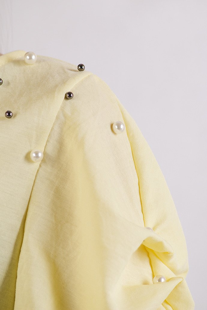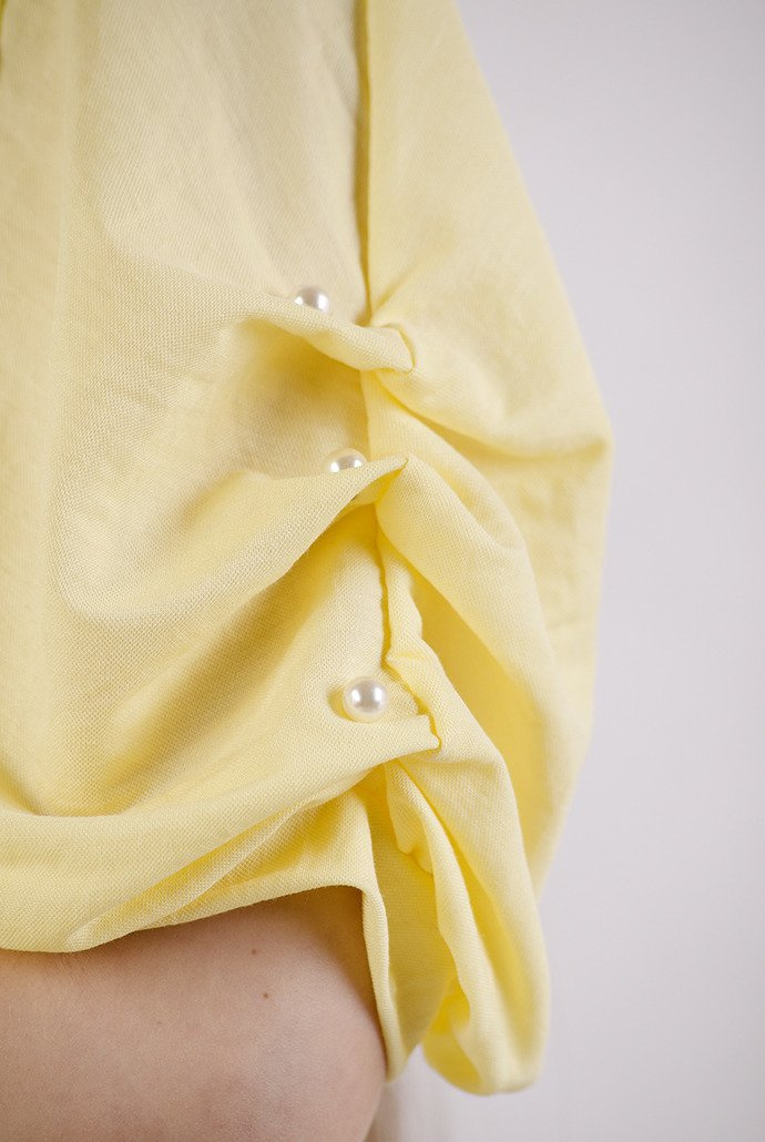 Żółta bluzka z wycięciem na plecach oraz koralikami na ramionach