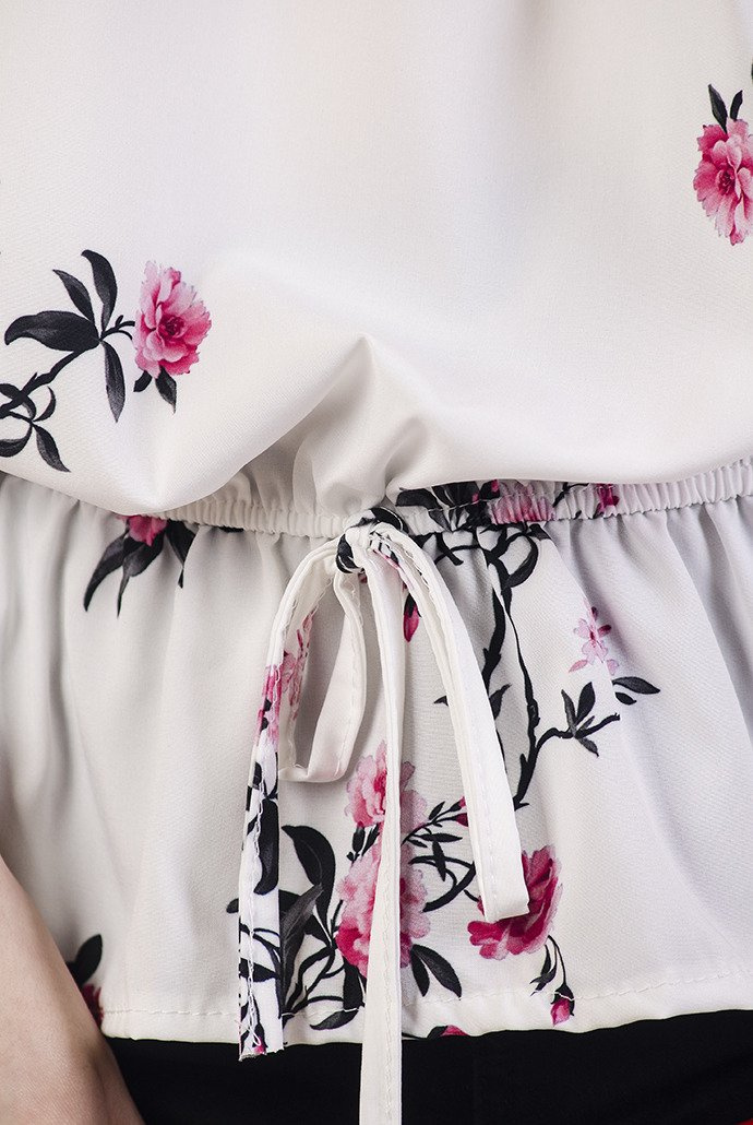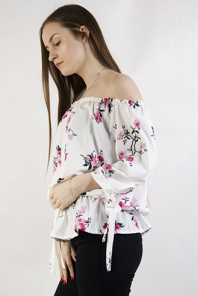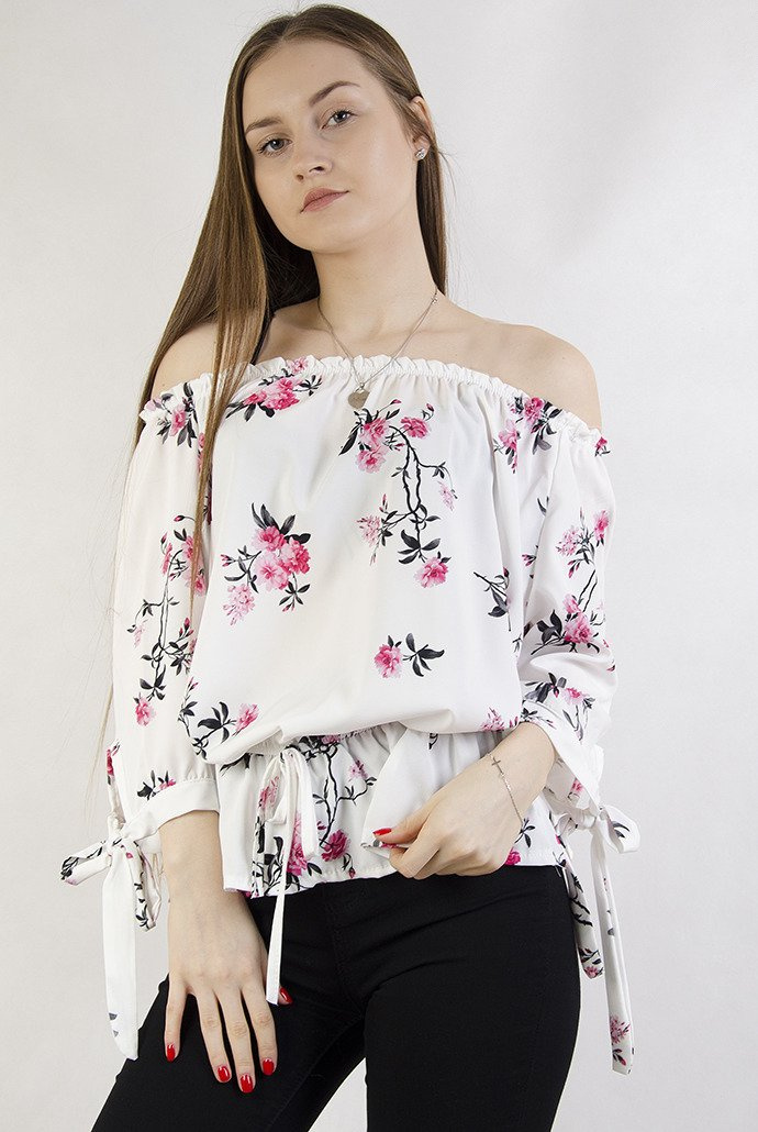 Biała bluzka w kwiaty z hiszpańskim dekoltem