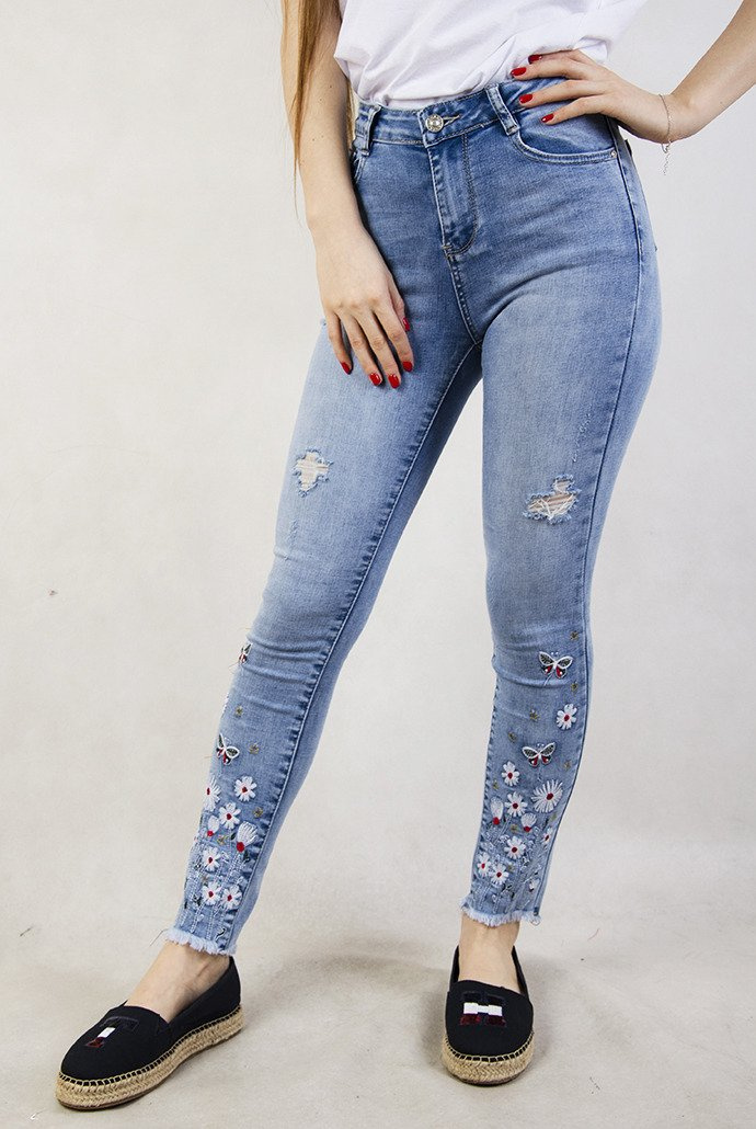 Jasne spodnie jeansowe z kolorowymi kwiatami