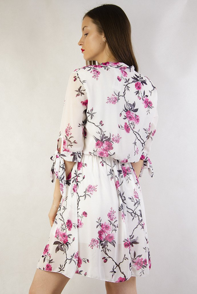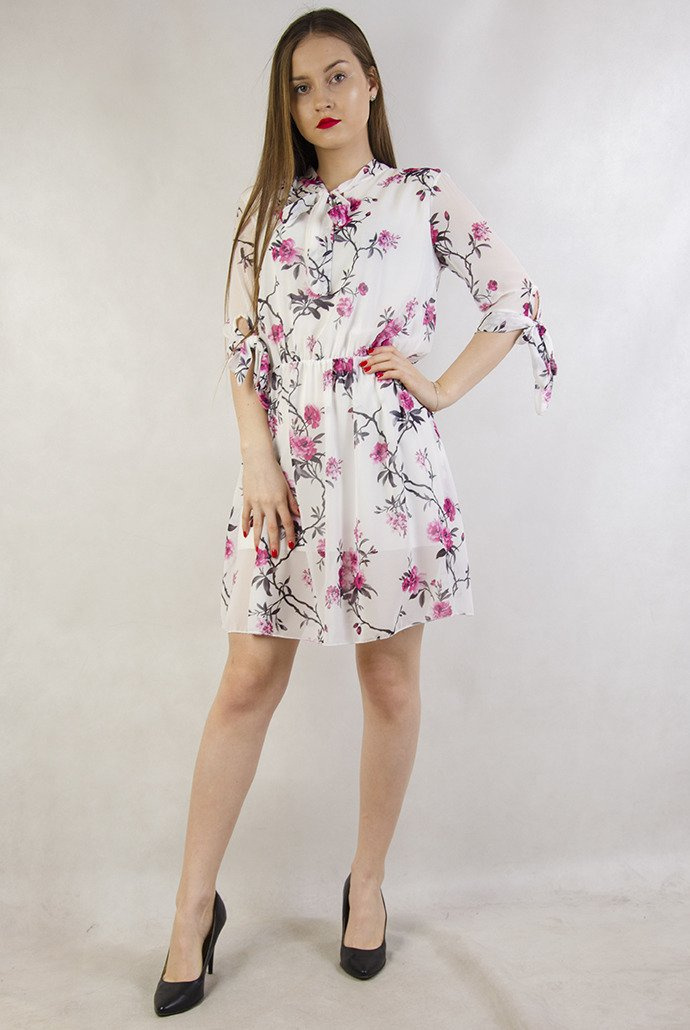 Biała zwiewna sukienka w kwiaty z gumką w pasie