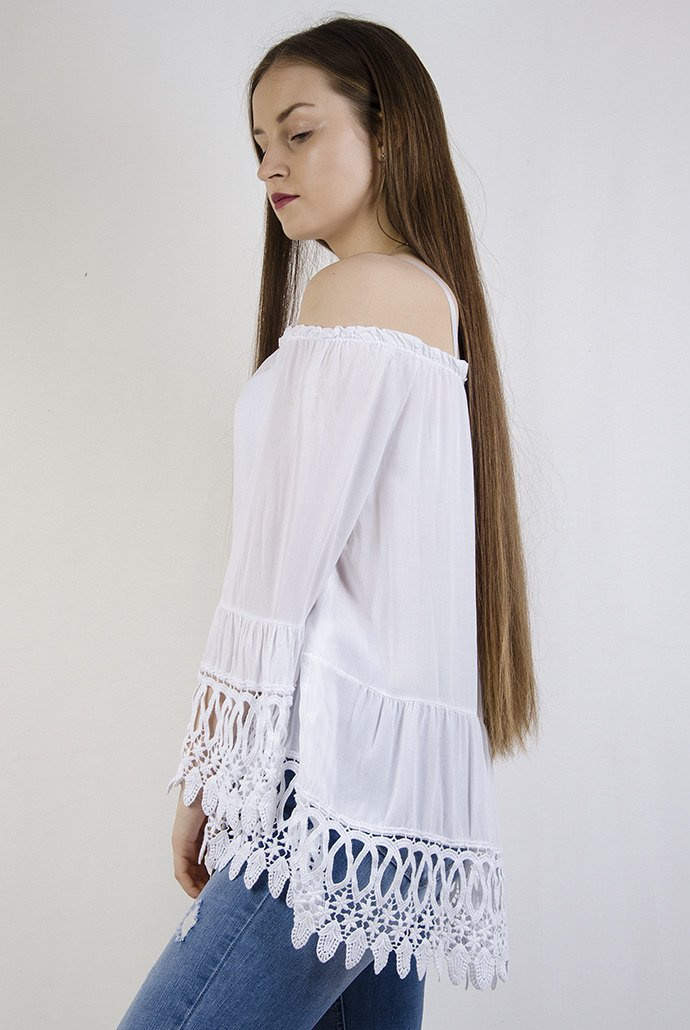 Biała bluzka z hiszpańskim dekoltem i ażurowymi wstawkami