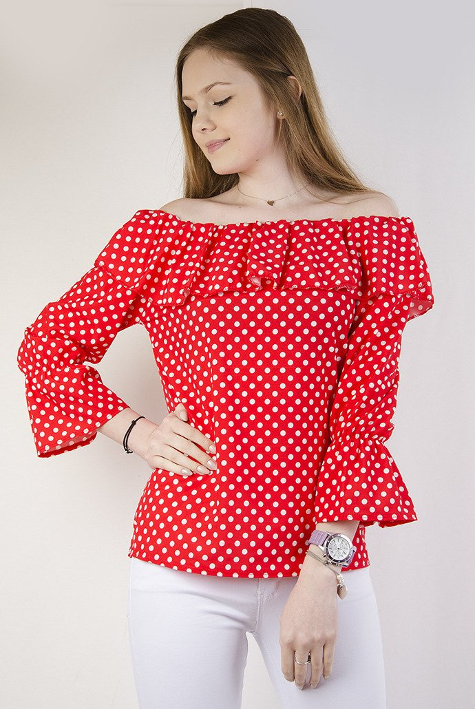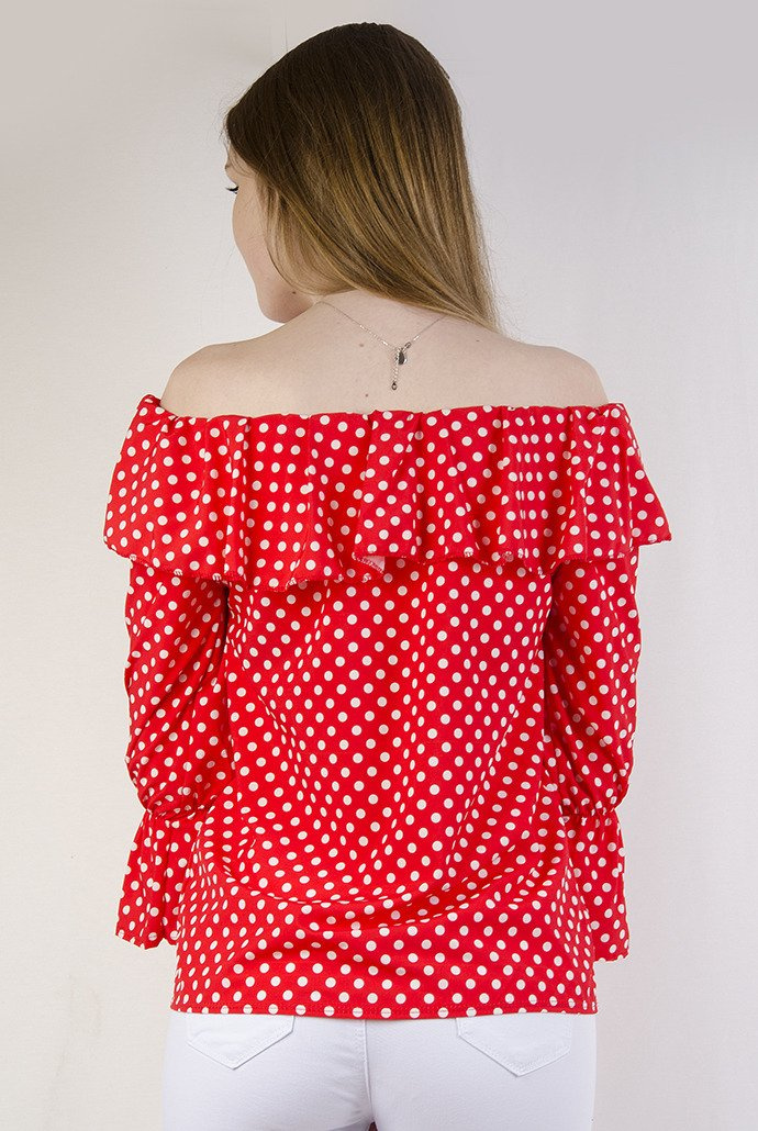 Czerwona bluzka z hiszpańskim dekoltem w grochy