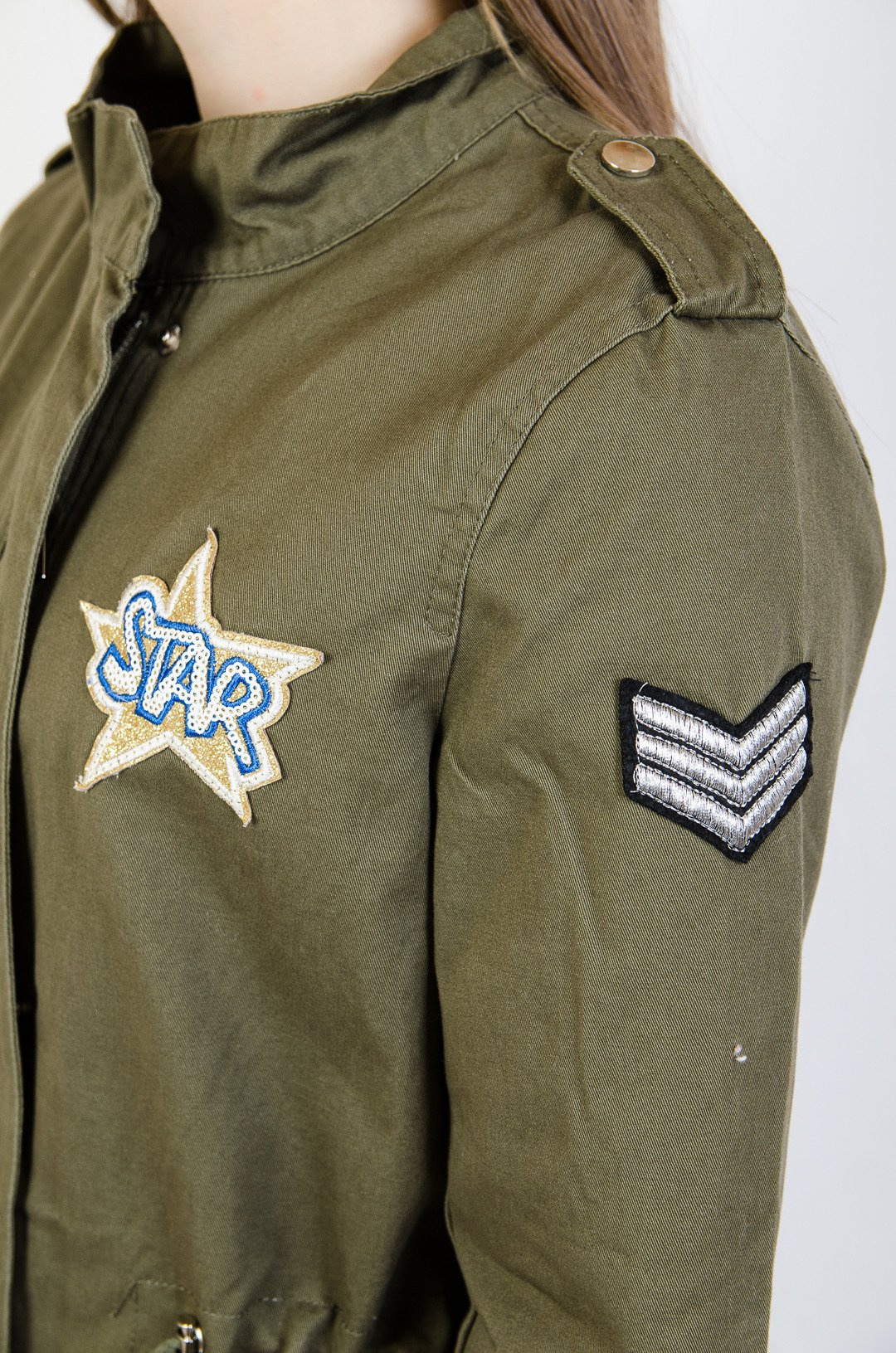 Kurtka przejściowa z napisem z tyłu.
