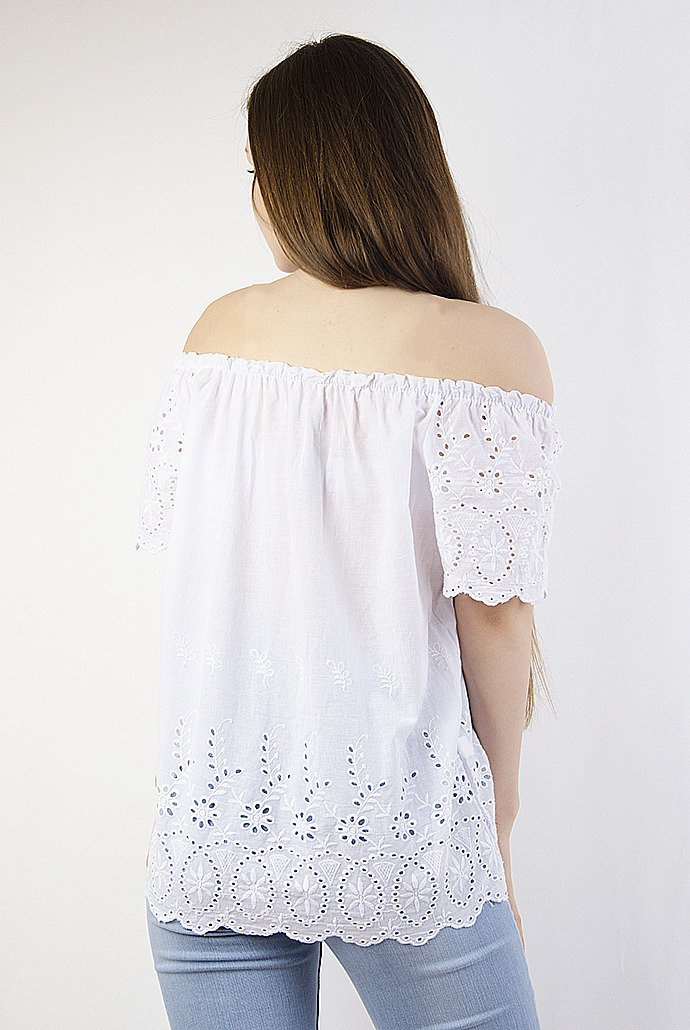 Biała bluzka z ażurowym zdobieniem oraz wiązaniem