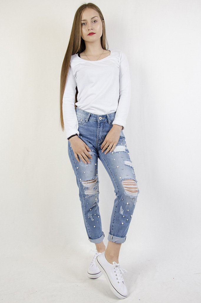 Spodnie jeansowe typu boyfriend z koralikami i przetarciami